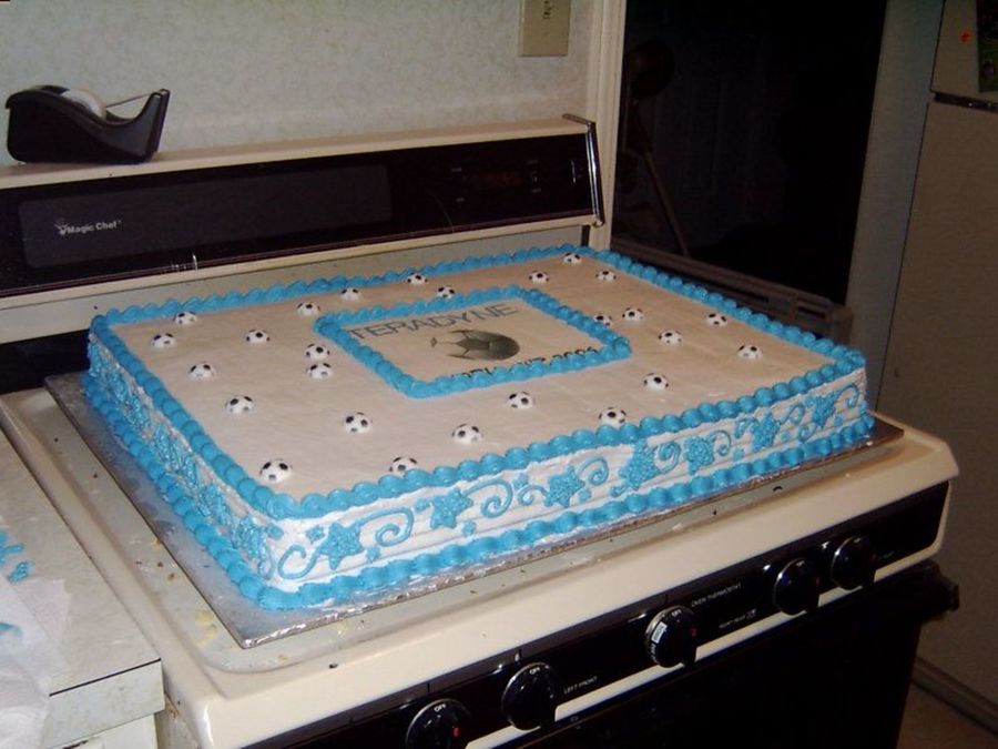This is a full sheet 1/2 choc. 1/2 yellow with straw. filling thru the whole cake. BC frosting, edible image w/ company logo, candy soccer balls on top.