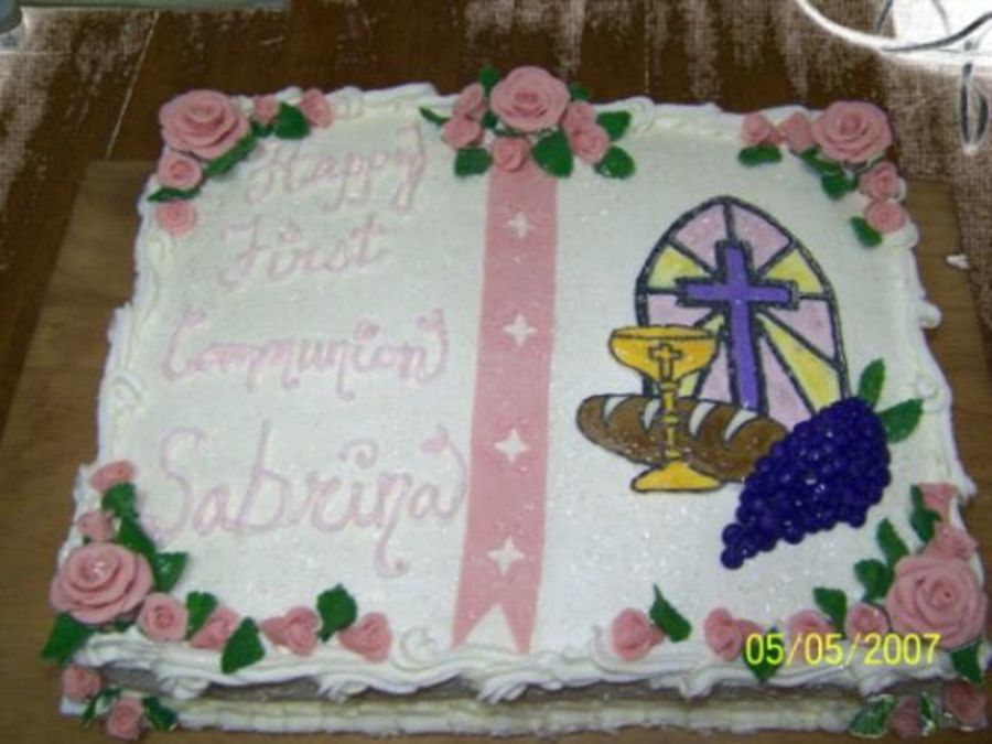 Buttercream icing. FBCT of window/chalice/bread. Grapes are buttercream. Roses, bookmark and leaves are candy clay. Wish I had carved the cake a bit more, so in the pictures it looked like a book cake...:P Thank you ev1 on CC for their inspiration for this cake!!!