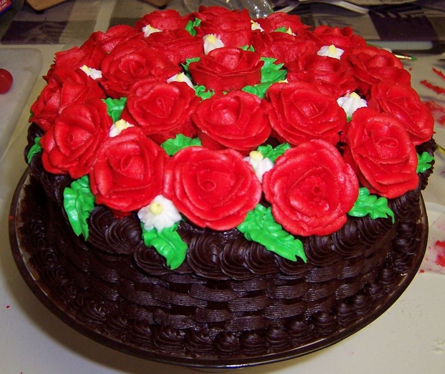 This cake was a nightmare from the beginning. The top layer crumbled on me and I had to try and save it. It is really lumpy, but I liked the roses. This was my first try at some serious roses. I had kind of messed around with them before, but I liked these. I definely have some different ideas for next time. Thanks for looking!