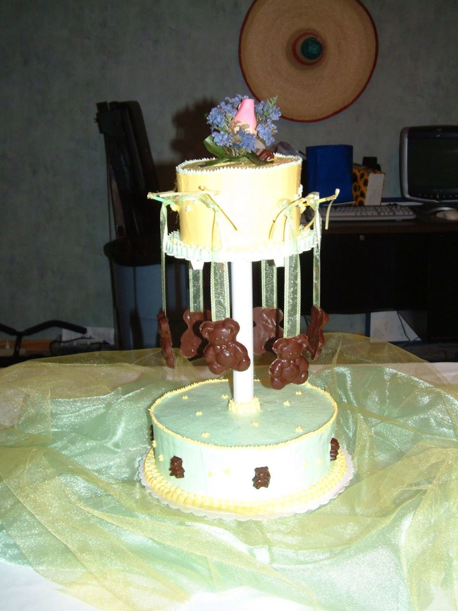The cake was a yellow cake with buttercream filling and buttercream icing as well. The bears I molded out of chocolate.