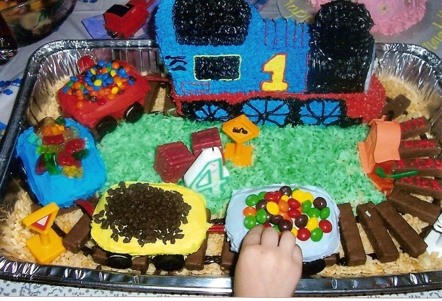 Thomas is a stand up train pan done in bc. on a track of wafer creme cookies and chocolate licorice, shredded coconut grass, train car cakes filled with candies. Fun for my sons 4th birthday!