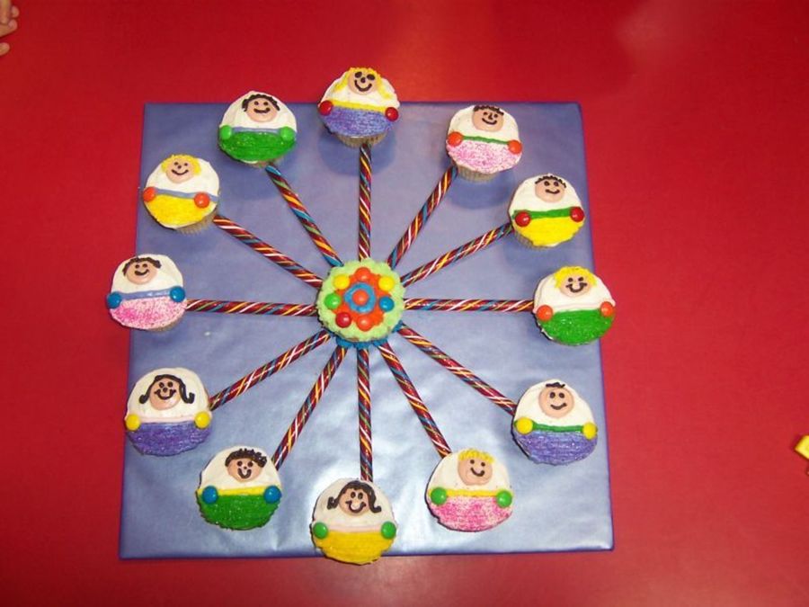 The little girl that I take care of saw the one Lybby2000 did and wanted me to make one for her snack day at school so this is my version of the ferris wheel. It's not my best, it was 1 am and I had just finished some other cake orders and I was so tired. The kids LOVED it and said it was the best snack EVER!!