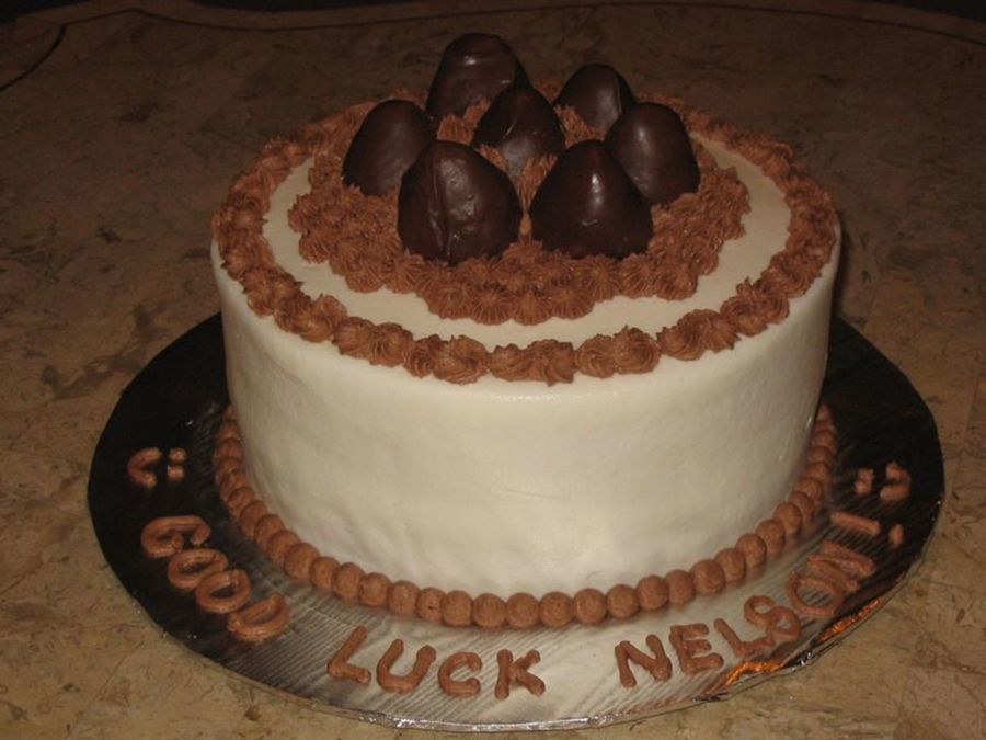 I made this cake for a friend that I work with that is transferring to another state. It is a french vanilla cake filled with chopped fresh strawberries and whipped cream, iced in buttercream & decorated with chocolate buttercream. The strawberries on top are dipped in chocolate.