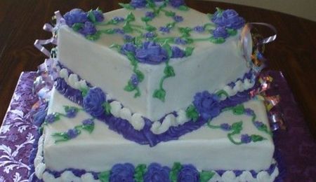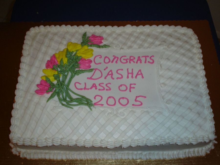 1/2 sheet cake with a lattice design on top. the flowers are a combination of a sweetpea and a tulip(which were the girls favorite flowers)