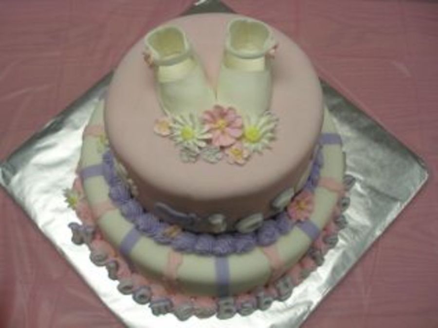 I made this for my sister's coworker's baby shower. White cake with buttercream. Cake was made with fondant, royal icing flowers, and gum paste baby shoes. There are a couple more pictures I will post of this cake.