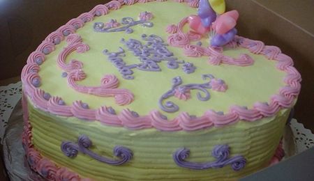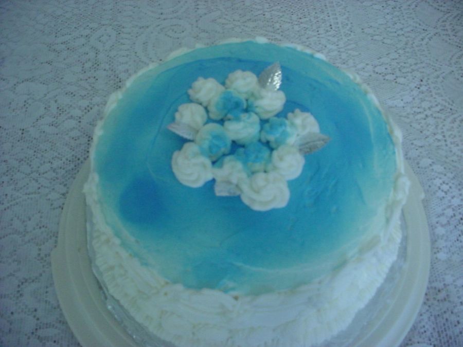 2 layer chocolate and yellow cake (1 layer of each). Iced and decorated with extra special buttercream icing. The top was colored with Wilton's color mist spray, my first time trying it. The side is decorated with piped white swans. My first time trying that technique. Overall this is just another cake to practic with.