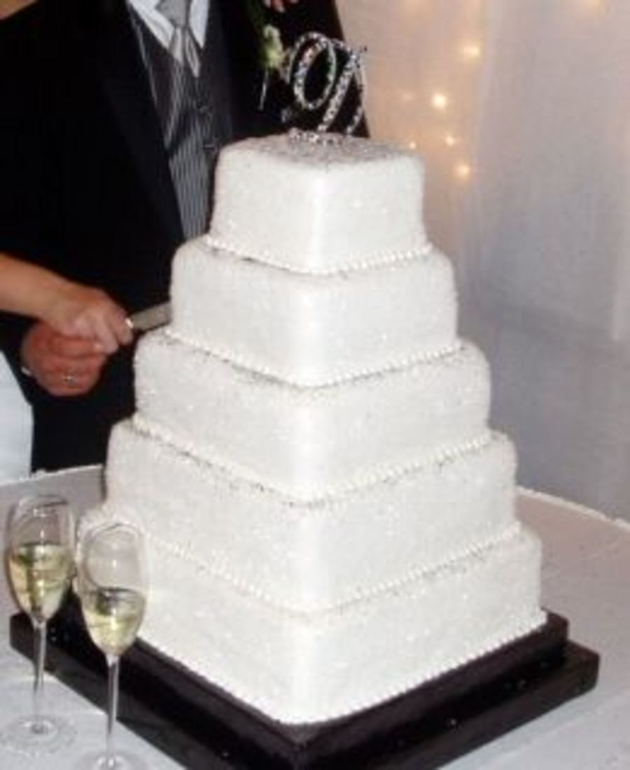 5 tiers of french vanilla cake, BC filling and covered in fondant. All tiers were covered in clear sparkling sugar than black sugar was sprinkled around the edges.