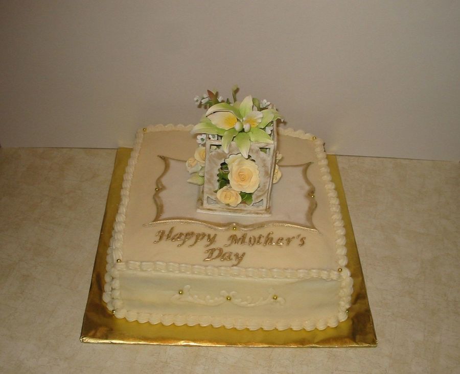 Cream cheesine icing, yellow cake with Bavarian cream filling, fondant pla plaque and gazebo.