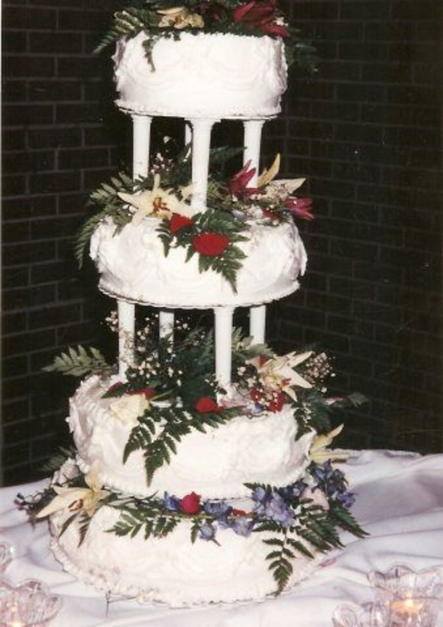 This was the very first wedding cake I ever made! It's difficult to see the detail, but it is a 3 flavored cake (white, lemon and chocolate ) with buttercream, and fresh flowers!