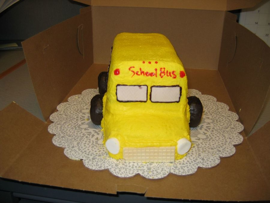 I made this for a childs first day riding the bus. It is was made with a loaf pan and the front end is a twinkie. The windows our half sticks of gum and the wheels are donuts.