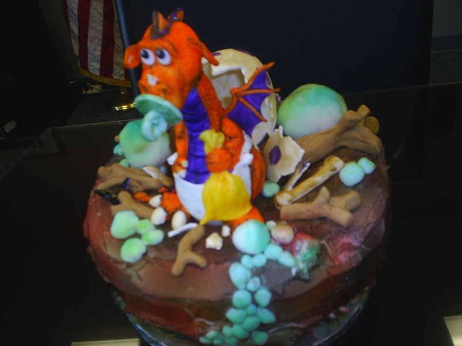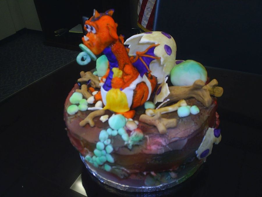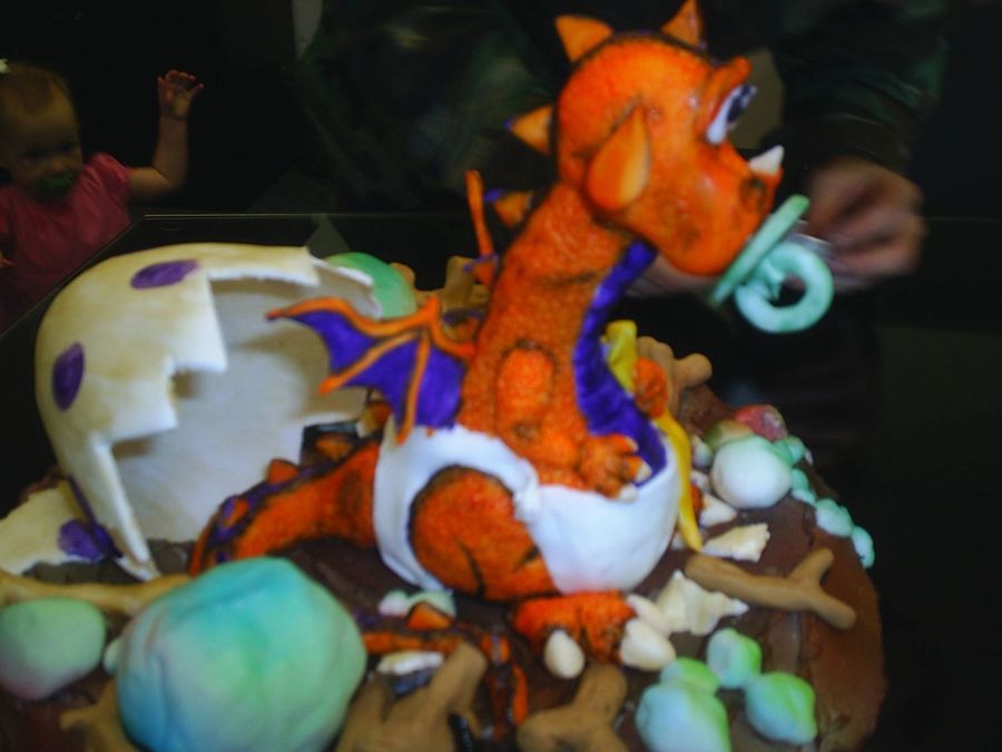The shell is made of gum paste. I put the gum paste on a Styrofoam egg for the shape then removed it. The dragon is fondant over rice crispy treats. I used a number 3 tip to give him scales. He is hand painted. Everything except the cake and egg is fondant.