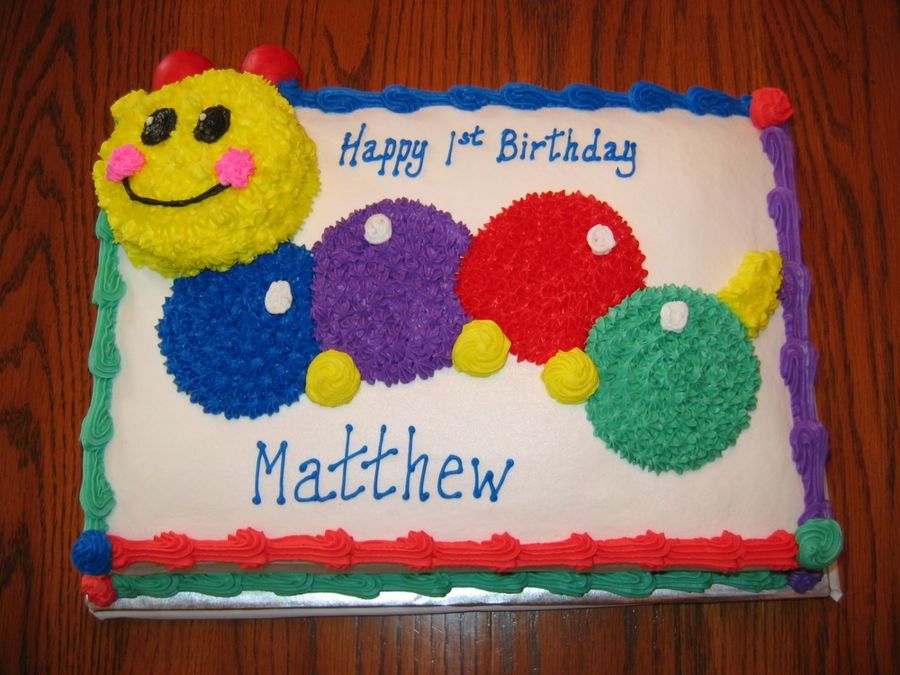 This cake was for a baby's first birthday. The caterpillar's head was the "smash cake". White cake with red raspberry filling and buttercream icing.