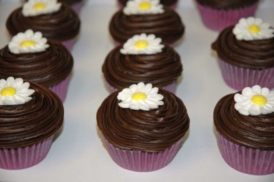 I saw these in the new wilton cup cake book & wanted to give them a try. Made these for the teacher's appreciation week. Liners are made from candy melts. Royal icing Daisies. Discovered the trick is to bake your cup cakes first. Then melt the candy in the cup cake liners, spread it up the sides then place the cooled cup cake into the candy liner & put it back into the baking pan to firm up. After it's cooled, peel off the paper and decorate. Looks much more impressive IRL. My husband was even impressed.