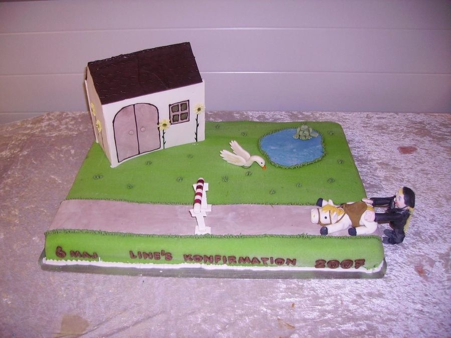 This is a confirmationscake I made for my sisters daughter last sunday. The cake is filled with strawberrymousse and tobleronecream. It tasted great. The figurines and the stabelhouse are made in gumpaste. The roof is made in chocolate.