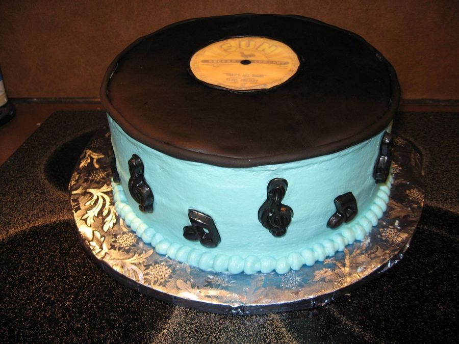 Made this for an Elvis themed birthday party. Fondant and edible image on top. Musical notes made of chocolate I colored black.