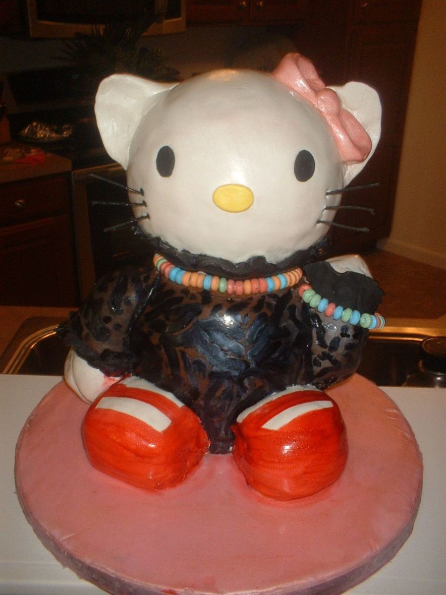 This was my first time doing a 3D cake of this magnitude! I made if for my sister's 16th birthday, she loves Hello Kitty. It is all cake covered with some chocopan and some modeling chocolate I made. It's supposed to have a leopard print cardigan with ruffle neck and cuffs, but it's hard to see the detail. I can certainly see all of my mistakes, but overall, I was really pleased with how it turned out!