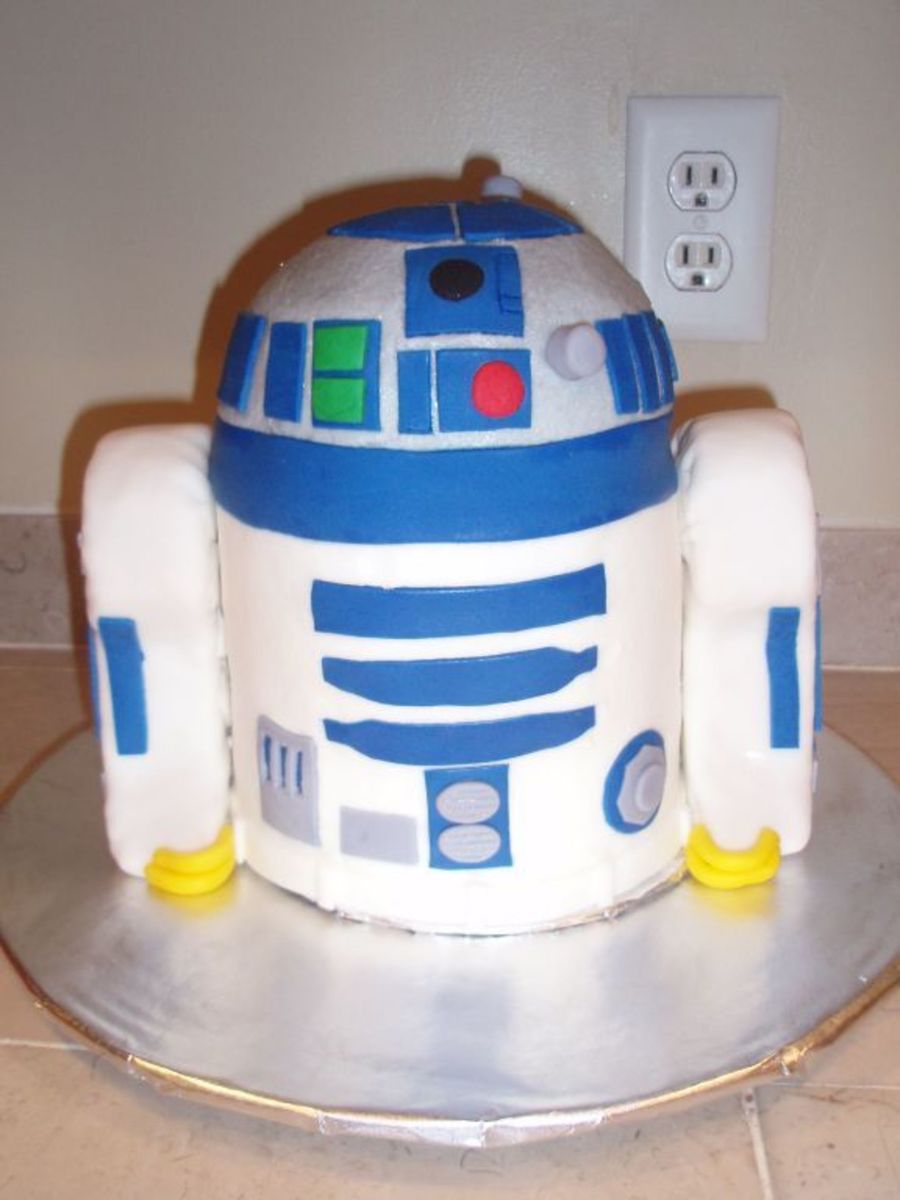 This is my attempt at R2D2 for my son's 3rd birthday. It is three 6" layers with the ball pan half as the head iced in BC. The arms are rice krispy treats wrapped in fondant. The blue "lines" on the body are WAY to big but they were already glued on so I had to modify the bottom design. All color details on the body are fondant. I got many ideas from R2D2 photos in the galleries, thank you!