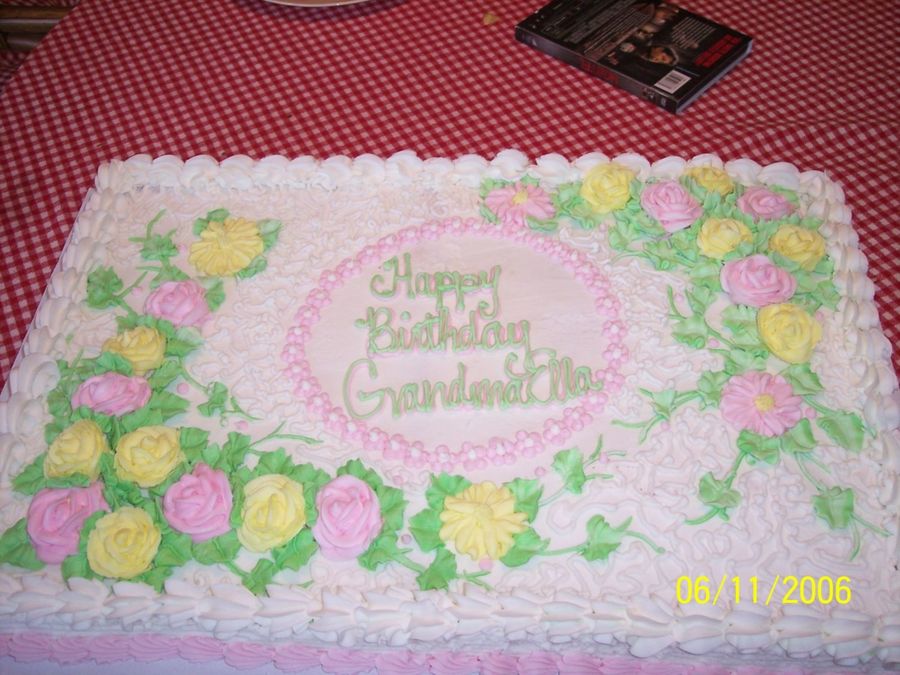 This is a full sheet cake done in lemon with butter cream icing. The flowers were the daughter's choice for her mom's birthday. I tried the cornelli lace technique...TRIED... I always find flaws in my cakes, but everyone at the party raved over this one.