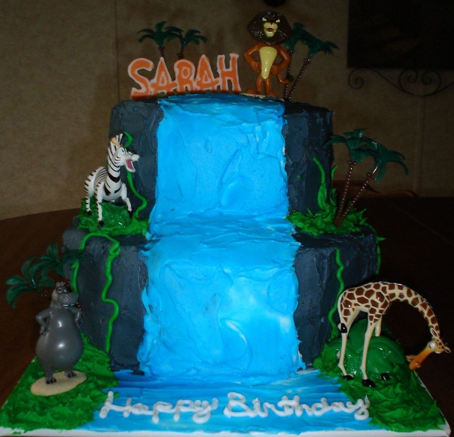 Madagascar cake for little girls birthday. Round cakes carved into a "mountain". Cake kit bought from walmart.