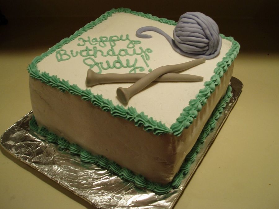 This cake was made for a women who loves knitting. Yarn and needles are fondant, rest of decorations are buttercream.