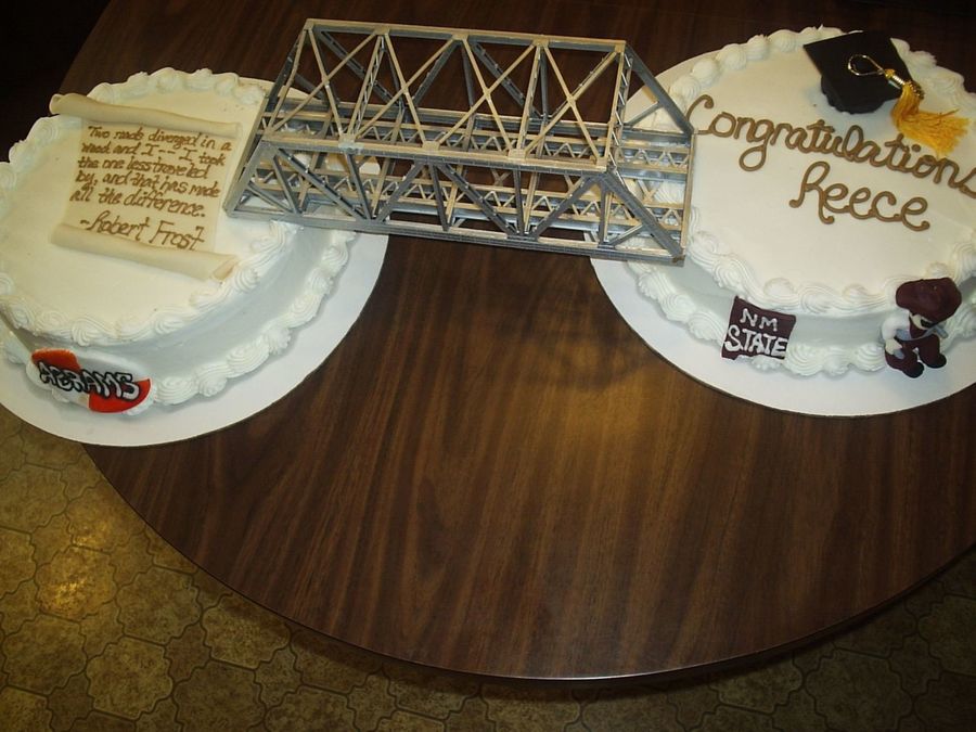 I did this cake for my cousin who graduated from NMSU with a degree in Engineering. I used two 12" rounds, connected them with a bridge. I made a scroll out of fondant, and wrote the quote from his graduation announcements. On the front of one of the cakes was the logo for the company he will be working for. On the second cake, I covered a cupcake in fondant, and made it into a graduation cap. On the front of that cake is the logo for NMSU, as well as my replica of Pistol Pete. It was a lot of fun!
