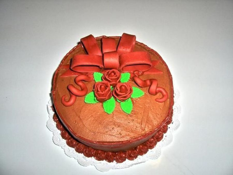 This was the cake I was going to give my mother-in-law for her birthday, but the bow wouldn't cooperate!!! My husband was glad because it was a chocolate cake. His favorite, so I let him have this one. It was good practice for me, so it wasn't a loss!!! It's iced with chocolate bc with fondant roses left from Bible cake. (made these cake the same day!!!)