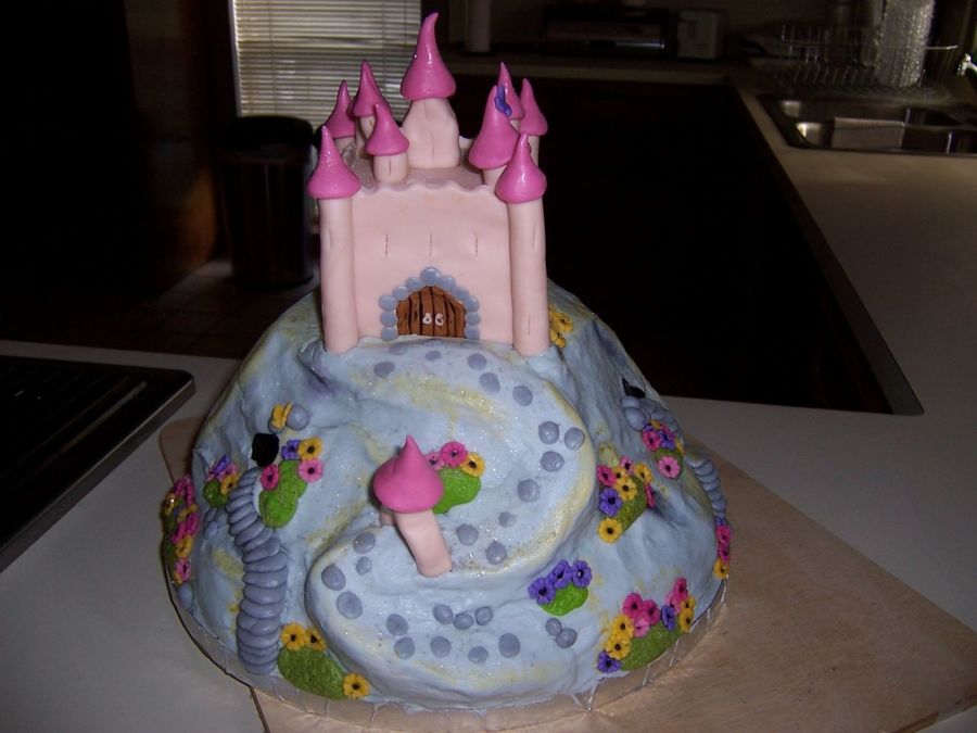 This cake is supposed to be fondant, but I used Buttercream for the mountain. The castle is fondant. The flower colors reflected the little girl's colors. Cake was a dense yellow cake.