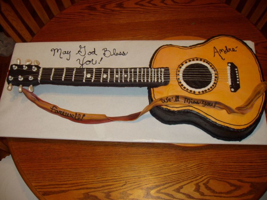 A very good duplicate of a real guitar!!! Did you make the straps out of fondant? What about the strings and the tuner things on the top of the guitar? A really great looking cake.