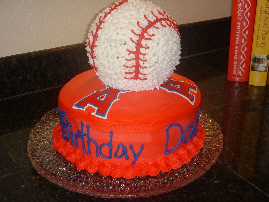 I just finished this one for my Dad's birthday tonight. Its all Paula Deen's Bananna Nut Cake, the bottom tier has my Nana's custard for filling. I did the Angel's logo in FBCT, then used my sports ball pan. My piping is getting worse and worse, so I have some definite issues with my baseball stitching. (I'm in the works for carpal tunnel surgery.) This was of course inspired by many other cakes here on CC.