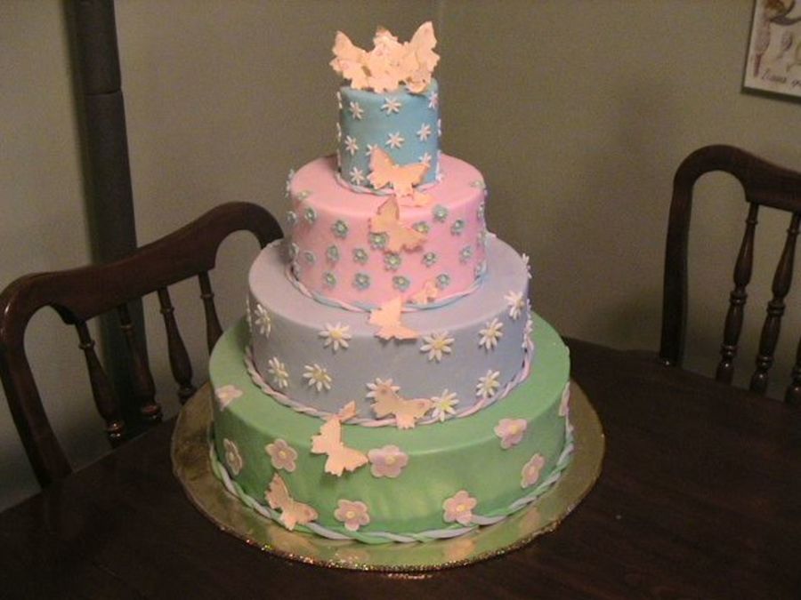 This was my other cake I made for a small cake show. I let my nieces and nephews design it for me. They picked the colors and the flowers and everything! I just did what they told me! It's MMF with MMF flowers and gumpasted butterflies. Thanks for looking!