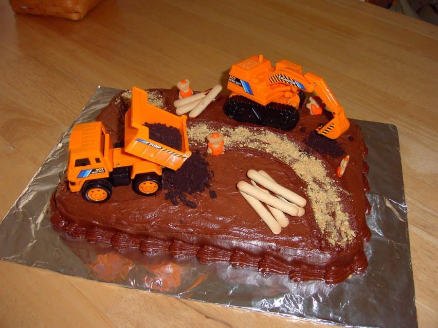 I used chocolate frosting on a 9x13 cake, construction trucks, crushed OREOS for dirt, Teddy Graham workers decorated with orange royal frosting, and cracker sticks for logs.