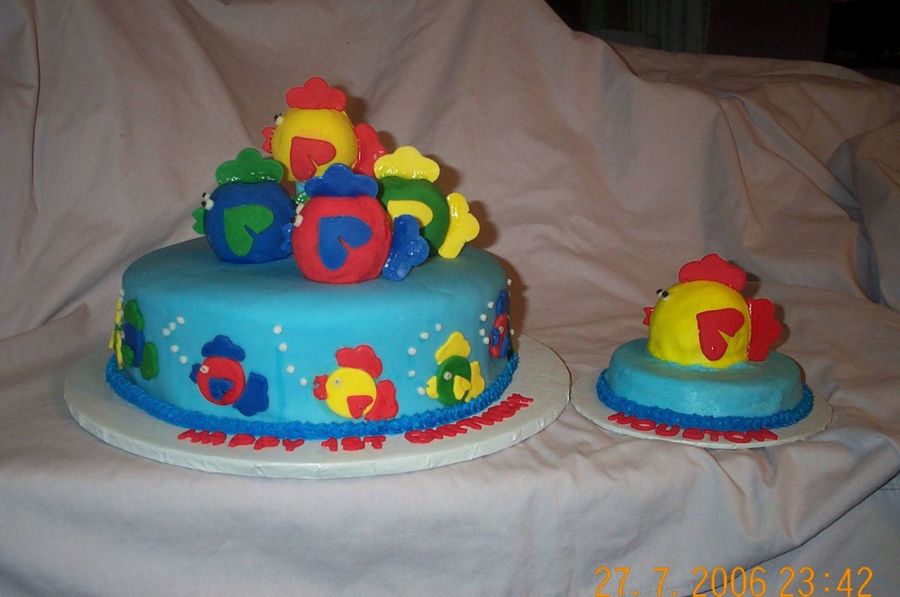 My take on the Fish Story cake from the 2007 Yearbook. The main cake is a 12" round covered and decorated in fondant. The smash cake is a 6" round and the mini ball iced and decorated in buttercream with fondant accents. Personally, I think the smash cake looks more like a chicken!