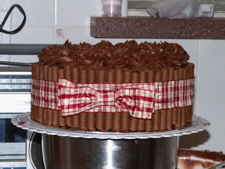 Made this for a co-worker, it is chocolate cake with chocoalte buttercream and wafer cookies around the outside