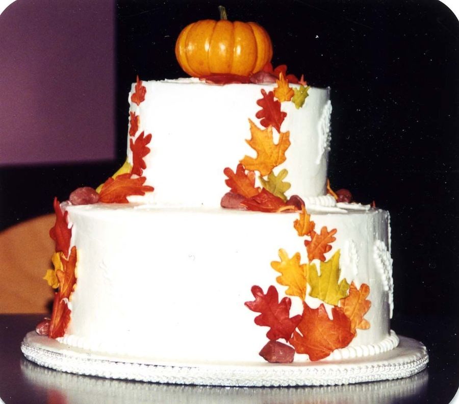 Two tiered fall wedding cake. Mini pumpkin topper. Fondant leaves and acorns. Carrot cake with vanilla buttercream.