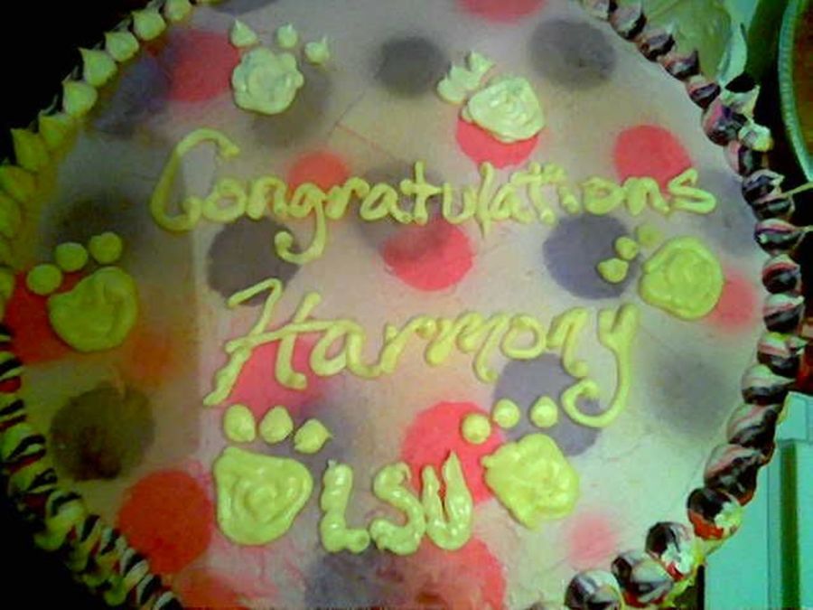 I didn't want to do a big grad cake with the hat because it was a smaller group. But I sprayed pink and purple polka dots and added hearts and paws on the side--graduated from LSU(Tigers). She loved it. It was white chocolate/cream cheese