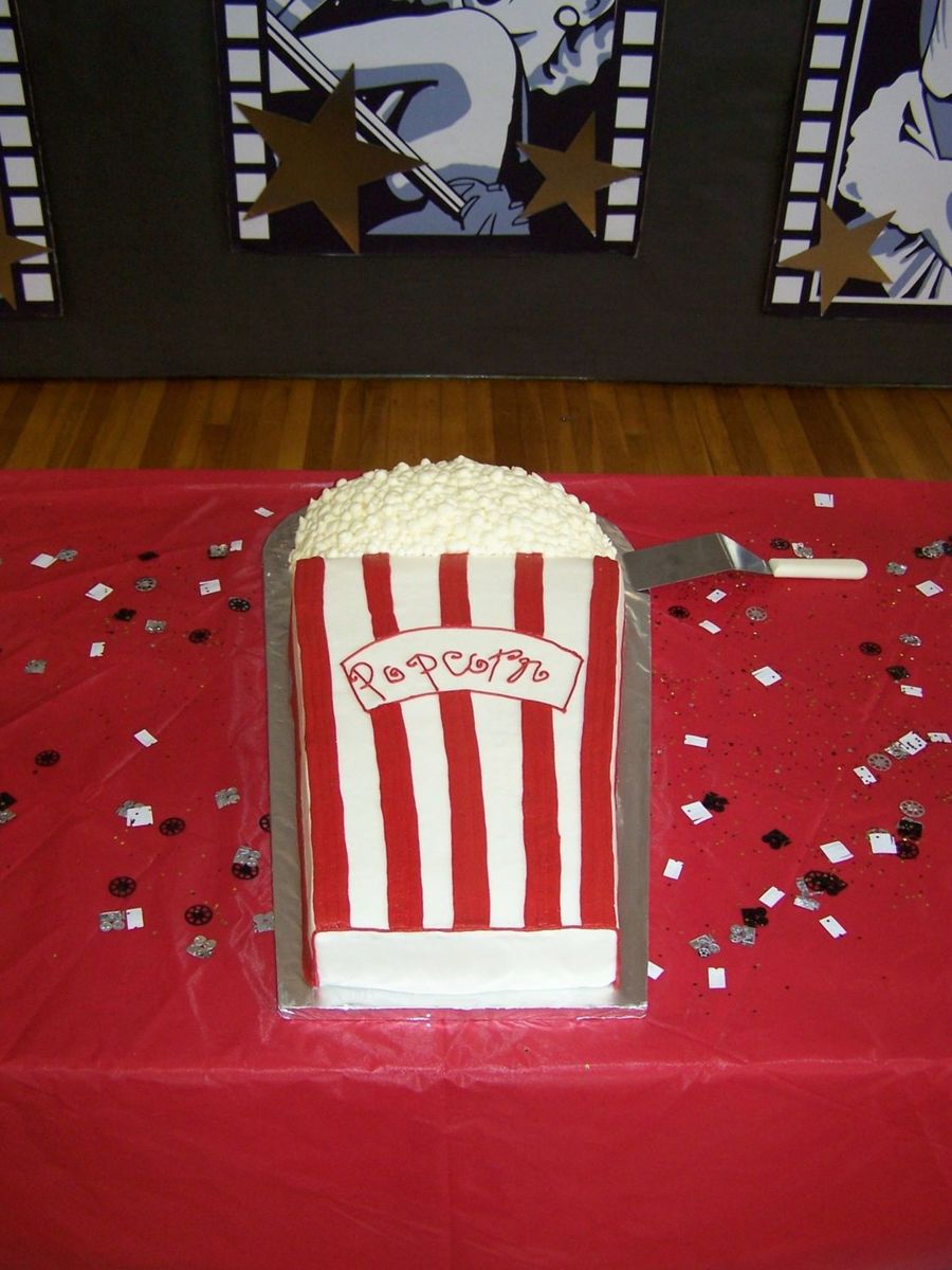 The theme for the 5th grade graduation was "Hollywood". This is one of three cakes they ordered. The cake is a 12 x 18. I trimmed the sides for the shape. The popcorn is buttercream (#9 tip at various sizes) with 4 layers of 1/2" foamcore under it. It's all decorated in buttercream.