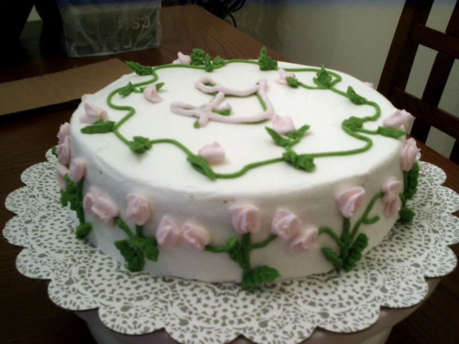 Butter pecan cake with caramel pecan nougat filling and buttercream frosting. Just practicing rosebuds and leaves.