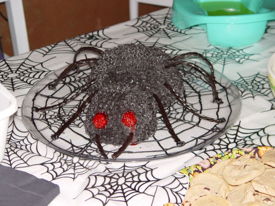 My first attempt at themed cake decorating. The head and body are devil's food cake baked in FireKing bowls. The icing is fudge tinted with black coloring.