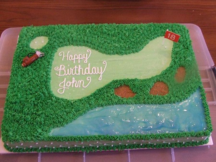 This was inspired by a cake I found here on Cake Central. I had purchased a golf cake kit at teh grocery store and added it to this cake. B/C frosting on chocolate cake. I used tinted piping gel for the water. This was a lot of fun to make. My friend just asked me to make a birthday cake for her dh with no specifics. She had mentioned he liked golf!
