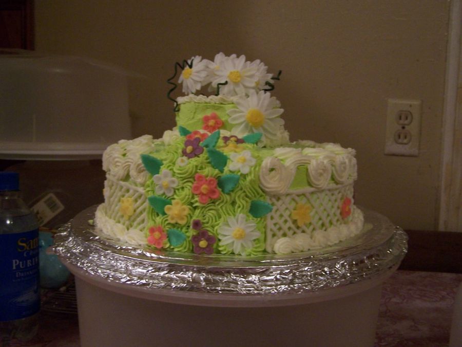 i made this for my mom on mothers day i call it my daisy cake ,its made with buttercream icing and fandant flowers and the fence is white chocolate