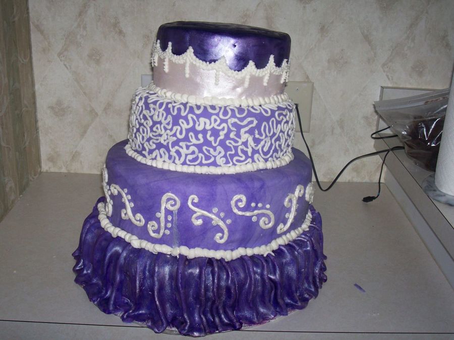 I made this cake after watching the Food Network's Wedding Cake Challenge. I loved the skirted cake and I had to make it. The cake was made for my students at school. I didn't put support in it, so................... it's leaning. I also used luster dust.