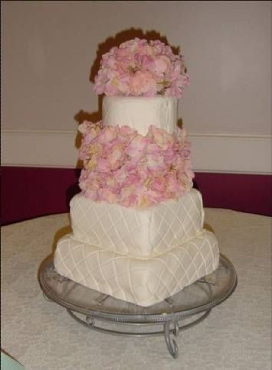 This is a 3 tier wedding cake covered in ivory tinted marshmallow frosting with diamond accents. The bottom and top layer are both yellow cake, with the middle layer a marble cake. The flowers between and on top of the top layer are a silk arrangement.