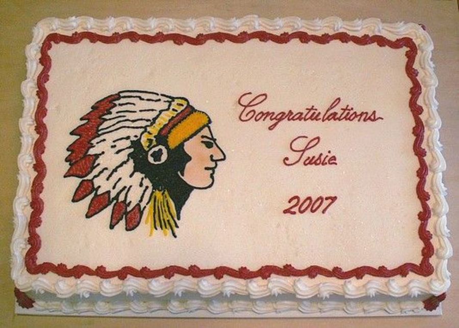 "Redskins" logo Indian head graduation. All done in buttercream. I later added some red rosebuds and green leave in the lower right corner; I felt it needed another color.