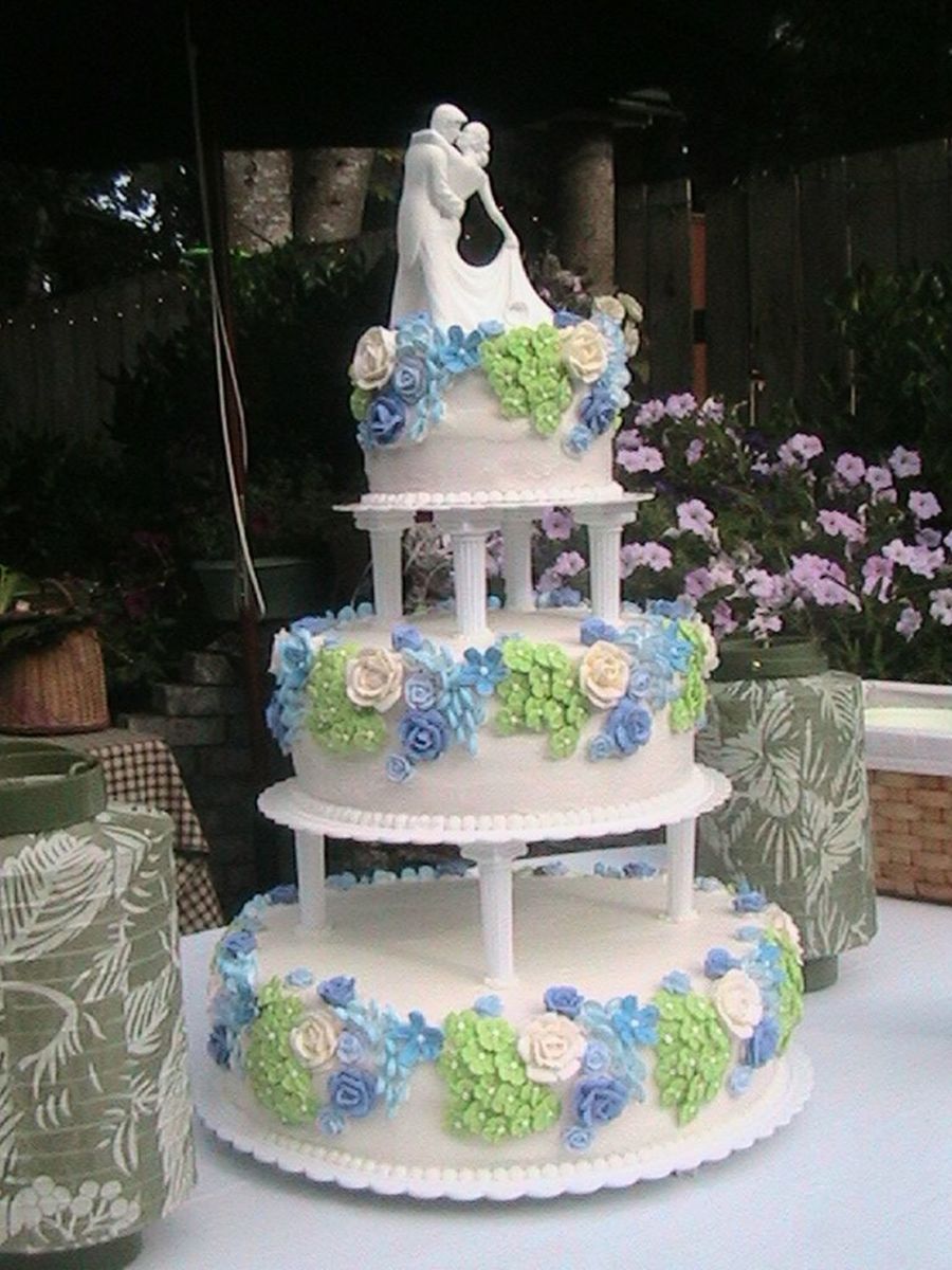 I haven't done anything with decorating for a year and have only taken the first two Wilton classes. So this was my first actual cake I have ever done. I got the design from the Wilton Tiered Cakes book. It was definately a learning experience and I had some tense moments as I delivered it. It was so hot and all I could do was sit and watch the frosting slide off. I was able to do some quick repairs and I think it turned out okay and the people loved it, I guess that is what matters.