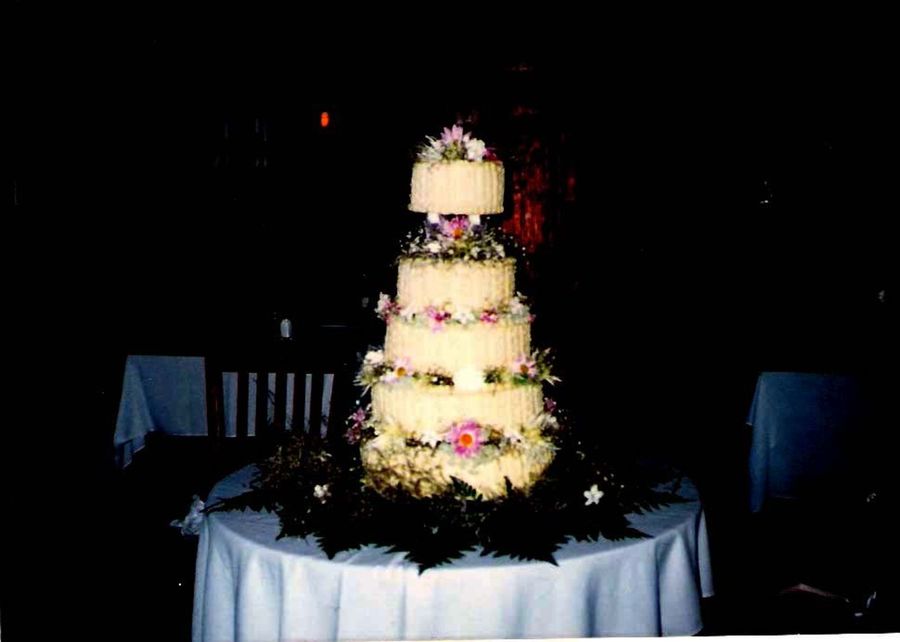 Rum Pound Cake with Ivory colored Buttercream iceing. Top tier held up with four crystal sherry glasses. Fresh flowers placed on each tier.