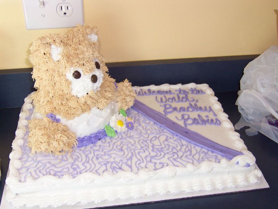 This is a 1/2 sheet cake cake with a sota design to resemble a blanket. On top is a stand-up bear with peanut butter icing for "fur" and chocolate candy eyes.