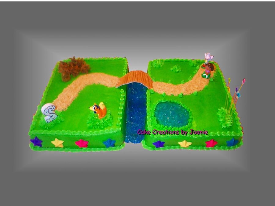 Dora the Explorer scene with royal icing "spooky forest", crushed nilla wafer road, blue jello river and pond, and fondant with royal icing bridge. I made this cake for my daughter's 2nd birthday. Cakes were triple chocolate with whipped chocolate cream and butter cake with strawberry buttercream both cakes are frosted in buttercream.