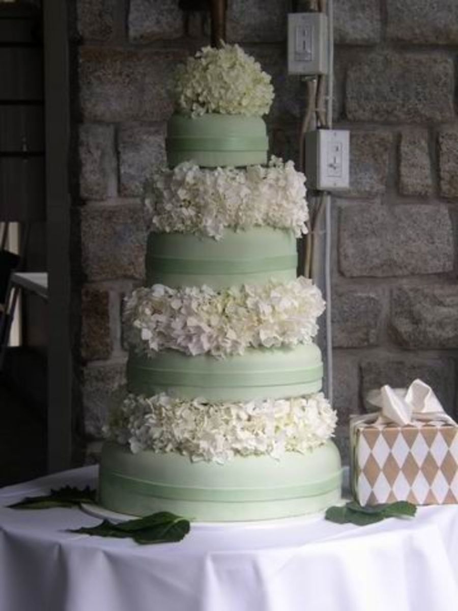 Based on a Martha Stewart design, this wedding cake features tiers of celadon colored cakes, separated by tiers of lush hydrangeas. The flowers were cut from the bride's garden to give special meaning to an all ready beautiful cake.