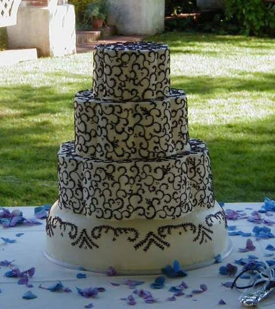 This cake is a Martha Stewart design. It features petal shaped cakes iced in Italian meringue buttercream and covered with intricately piped chocolate filigree.