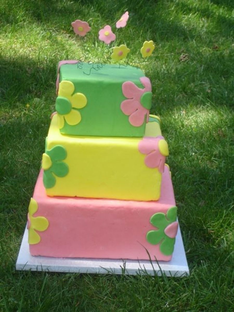 3 tier fondant covered dummy. Made for community sale a few days before Mother's Day. I really liked the springy wires with flowers on top. They were fun to play with.